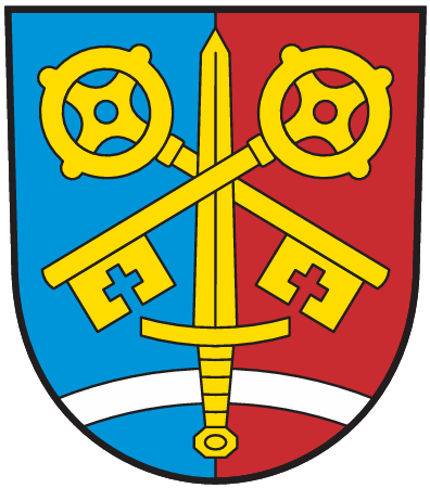 „V modro-červeně polceném štítě zlaté postavené přivrácené zkřížené klíče proložené zlatým vztyčeným mečem s jílcem podloženým zúženým stříbrným obloukovým břevnem.“